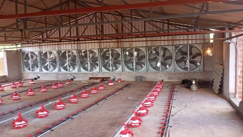 A ventilation system in poultry houses controls air quality, temperature, and humidity to create a healthy environment for birds. It ensures fresh air supply, removes harmful gases and moisture, and maintains comfort for better growth and productivity.